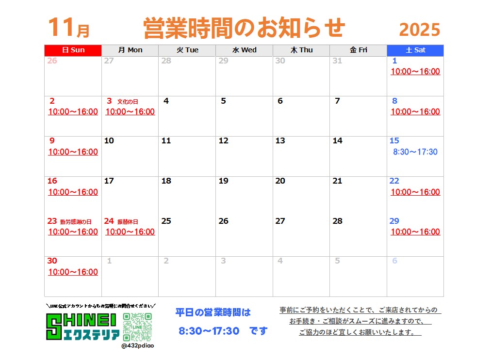 お知らせ news ホーム > ニュース > 11月の営業カレンダーを公開しました 11月の営業カレンダーを公開しました 2025.11.10 2025年11月営業日カレンダーを公開いたしました。 ご来場の際には、ご面倒ではございますが 電話もしくはメールにてご予約をいただけますと ありがたいです。 ご来場、こころよりお待ちしております 竹蔵カタログ商品販売停止のお知ら... ニュース一覧へ