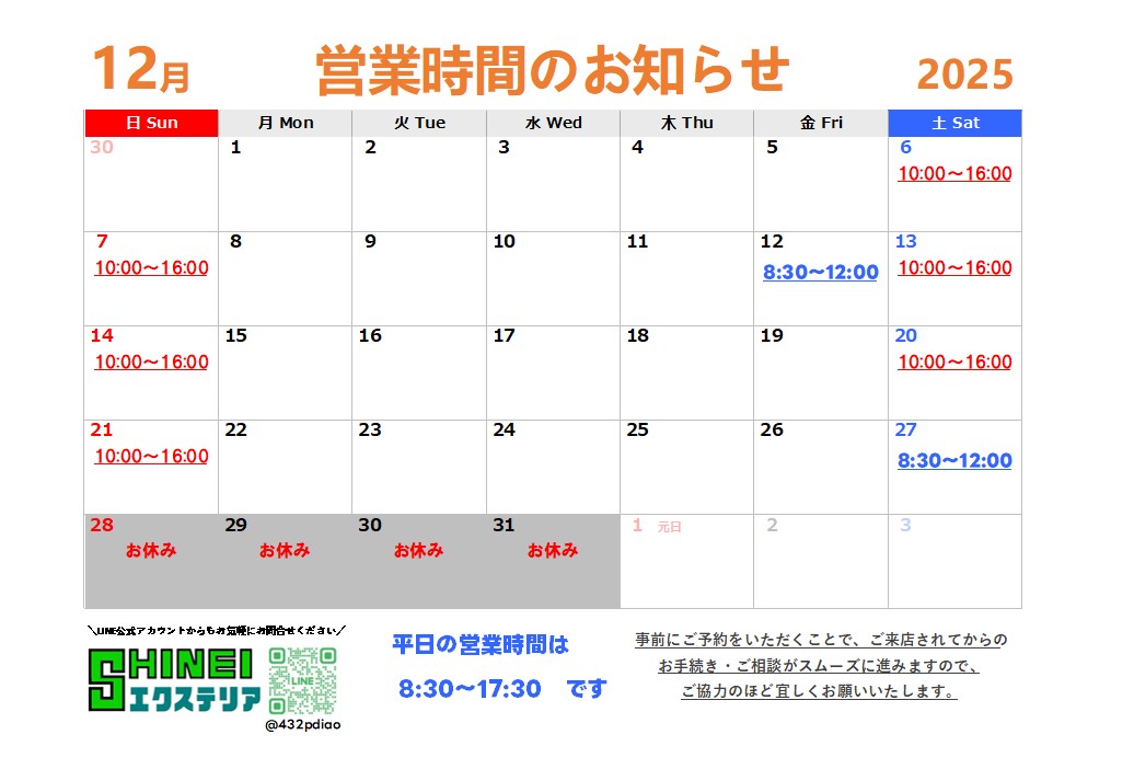 お知らせ news ホーム > ニュース > 12月の営業カレンダーを公開しました 12月の営業カレンダーを公開しました 2025.12.1 2025年12月営業日カレンダーを公開いたしました。 ご来場の際には、ご面倒ではございますが 電話もしくはメールにてご予約をいただけますと ありがたいです。 ご来場、こころよりお待ちしております 竹蔵カタログ商品販売停止のお知ら... ニュース一覧へ 1月の営業カレンダーを公開しまし...